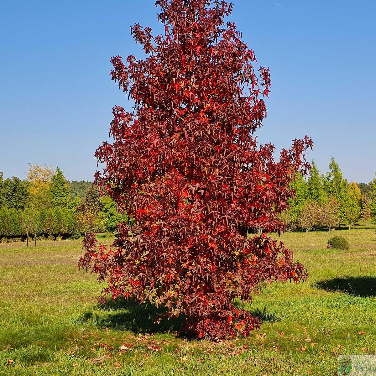Ambrowiec amerykański to majestatyczne drzewo liściaste, znane ze swojej spektakularnej jesiennej szaty – jego pięcioklapowe liście przebarwiają się na intensywnie czerwone, pomarańczowe i purpurowe odcienie. Latem zdobi ogród gęstą, ciemnozieloną koroną, a zimą zachwyca rzeźbiarską sylwetką. Kora drzewa jest charakterystycznie korkowata, co dodatkowo zwiększa jego walory dekoracyjne. Pochodzi z Ameryki Północnej i osiąga do 20 m wysokości, więc wymaga przestrzeni. Jest odporny na miejskie warunki, ale preferuje spokojne, osłonięte miejsca. Może być sadzony jako soliter lub w grupach w parkach i dużych ogrodach.