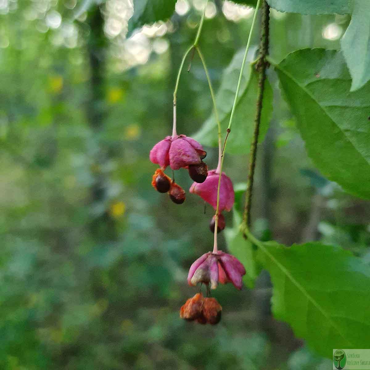 Trzmielina charakteryzuje się również ciekawymi owocami – małymi, różowymi lub czerwonymi torebkami, które po rozwarciu odsłaniają pomarańczowe nasiona.