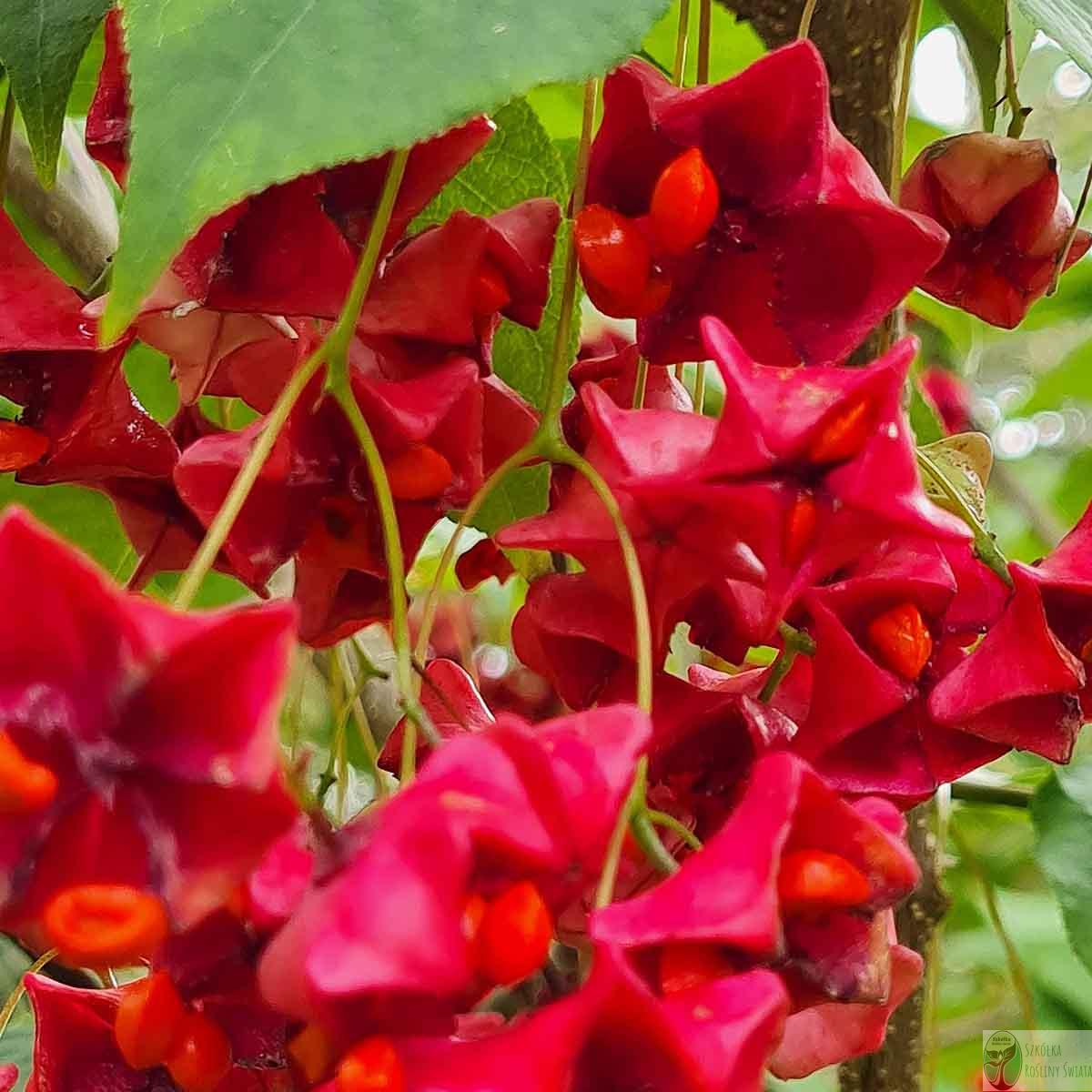 Trzmielina charakteryzuje się również ciekawymi owocami – małymi, różowymi lub czerwonymi torebkami, które po rozwarciu odsłaniają pomarańczowe nasiona.